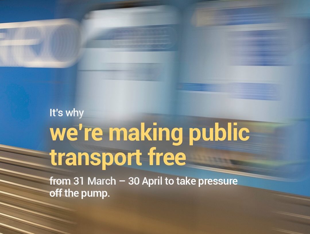 अष्ट्रेलियाको भिक्टोरिया राज्य सरकारले अप्रिल महिनाभर सार्वजनिक यातायात निःशुल्क गर्ने घोषणा गरेको छ। बढ्दो इन्धन मूल्यका कारण सर्वसाधारणलाई राहत दिन यो निर्णय लिइएको हो। सरकारका