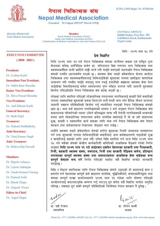 ‘सुरक्षाको नाममा भिभिआईपीको सवारीबाट आम सर्वसाधारणले पाइरहेको दुःख र सास्तीलाई सदाको लागि अन्त गरी उचित विधि स्थापित गर्न आज मिति २०७९ माघ २८ गते बसेको संघको केन्द्रीय कार्यकारिणी समितिको आकस्मिक बैठकलेगरेको निर्णय अनुसार मिति २०७९ माघ २९ गते आईतबार एकदिन देशभरका सरकारी तथा गैरसरकारी, निजी, सहकारी स्वास्थ्य संस्था, अस्पताल, निजी तथा सरकारी मेडिकल कलेज, प्रतिष्ठान लगायतका सम्पूर्ण स्वास्थ्य संस्था तथा अस्पतालहरुमा आकस्मिक सेवा बाहेकका अन्य सम्पूर्ण सेवाहरु बन्द गर्ने निर्णय गरिएको’ संघले जारी गरेको विज्ञप्तिमा उल्लेख छ ।