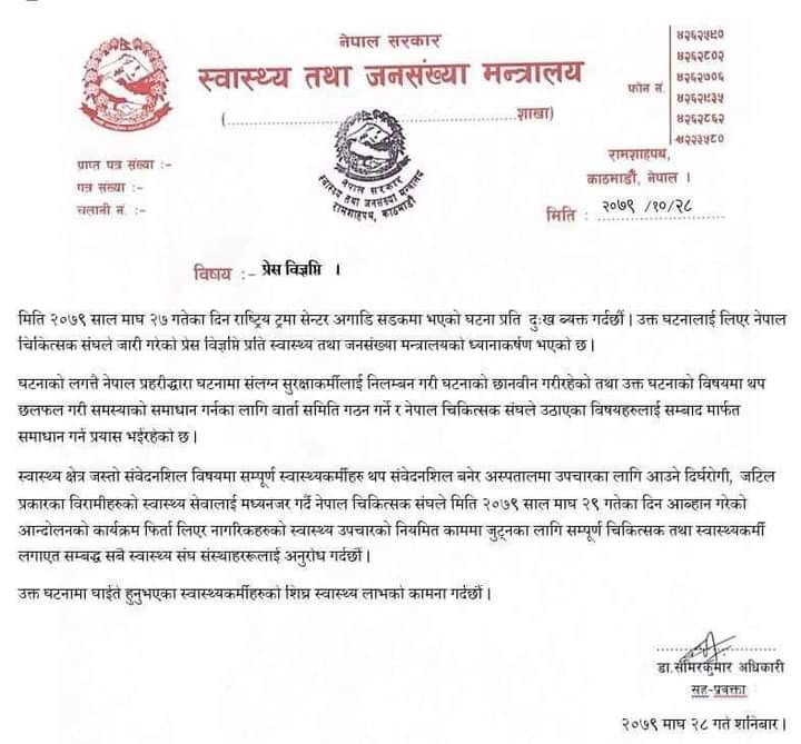 मन्त्रालयका सहप्रवक्ता डा समिरकुमार अधिकारीले जारी गरेको बिज्ञप्ति अनुसार आन्दोलनरत चिकित्सक सङ्घलाई आन्दोलनका सबै कार्यक्रम फिर्ता लिएर स्वास्थ्योपचारको नियमित काममा जुट्न सबै चिकित्सक तथा स्वास्थ्यकर्मीलाई स्वास्थ्य मन्त्रालयले अनुरोध गरेको हो ।