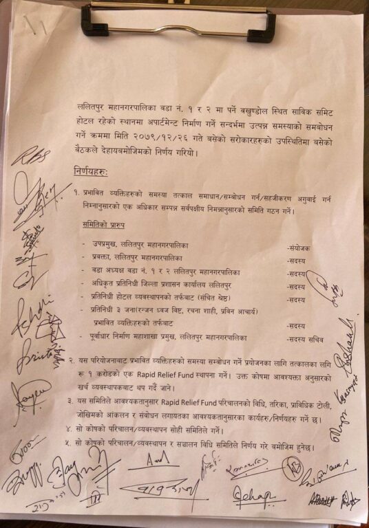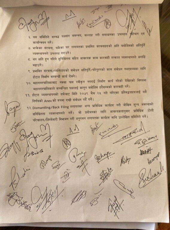 यस्तै, रोडको आकस्मिक सहजीकरण कोष खडा गर्ने, घर चर्केका तथा भत्केकाहरूको मर्मत, निर्माण अपार्टमेन्ट व्यवस्थापन गर्ने र तत्काल अपार्टमेन्टले बाँकी निर्माणको काम नगर्ने सहमति भएको हो।