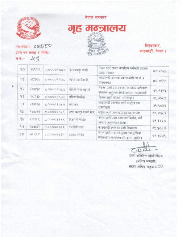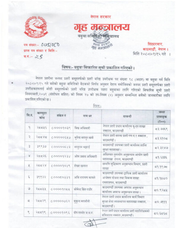 जनपद प्रहरी समूहका एसपीलाई एसएसपीमा बढुवाका लागि सिफारिस गरिएको बढुवा समिति सदस्य सचिव तथा प्रहरी अतिरिक्त महानिरीक्षक सन्दीप भण्डारीले जनाकारी दिएका छन् ।