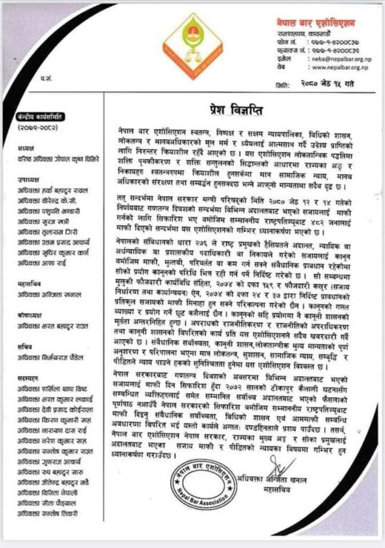 पीडितको न्यायप्रति गम्भीर हुने आग्रह गर्दै बार महासचिव अधिवक्ता अन्जिता खनालले सोमबार जारी गरेको विज्ञप्तिमा भनिएको छ, ‘विभिन्न अदालतबाट भएको सजायलाई माफी दिन सिफारिस हुँदा २०७२ सालको टीकापुर कैलाली घटनासँग सम्बन्धित व्यक्तिहरुलाई समेत सम्मानित सर्वोच्च अदालतबाट भएको फैसलाको पूर्णपाठ नआउँदै नेपाल सरकारको सिफारिस बमोजिम सम्माननीय राष्ट्रपतिज्यूबाट माफी दिइनु संवैधानिक सर्वोच्चता, विधिको शासन एवं आममाफी सम्बन्धि अवधारणा विपरित भई यस्तो कार्यले अन्ततः दण्डहिनताले प्रशय पाउँदछ। तसर्थ, नेपाल बार एशोसिएशन नेपाल सरकार, राज्यका मुख्य अङ्ग र सोका प्रमुखलाई अदालतबाट भएका सजाय माफी र पीडितको न्यायका विषयमा गम्भीर हुन ध्यानाकर्षण गराउँदछ।’