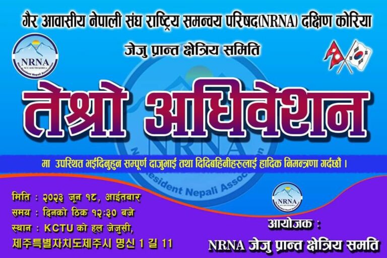 दक्षिण कोरियाको स्वशासित प्रान्त जेजुमा रहेका नेपालीले गैरआवासीय नेपाली संघ (एनआरएनए) को केन्द्रीय कार्यसमितिमा उपाध्यक्ष कोटाको माग गरेका छन्।