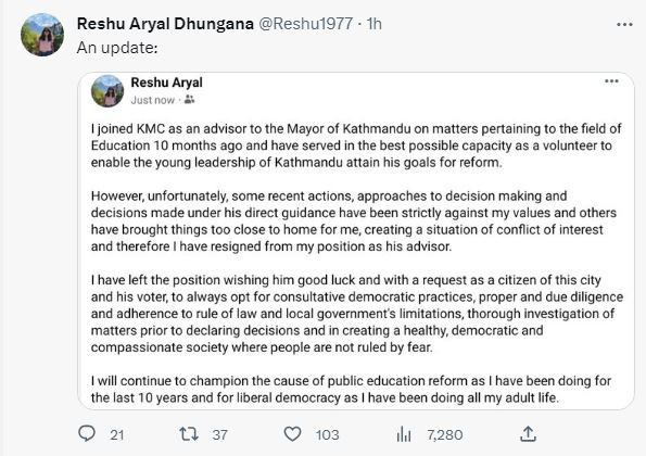 काठमाडौँ महानगरपालिकाको शिक्षा सल्लाकार रेशु अर्यालले आफ्नो पदबाट राजिनामा दिएकी छिन्। शिक्षा सल्लाकार अर्यालले महानगरपालिका प्रमुख बालेन्द्र शाह (बालेन) को कार्यशैलीमा असन्तुष्टि जनाउदै उक्त पदबाट राजिनामा दिएको बताएकी हुन्।