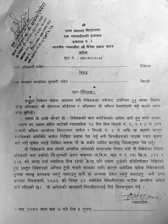 बिहीबार उच्च अदालतका न्यायाधीश दिनेशप्रसाद यादवको एकल इजलासले प्याराग्लाइडिङ व्यवसायी रोशन अधिकारी र रोजिना अधिकारीको जमिनमा प्रवेश नगर्न, उनीहरूमाथि धरपकड नगर्न आदेश दिएको हो।