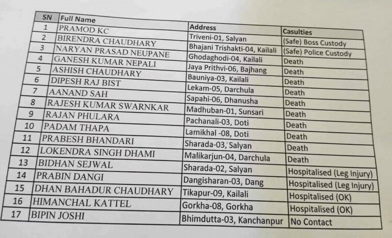 मृत्यु हुनेमा कैलालीका नारायणप्रसाद न्यौपाने, आशिष चौधरी, बझाङका गणेशकुमार नेपाली, दार्चुलाका दीपेशराज विष्ट, लोकेन्द्र सिंह धामी, धनुषाका आनन्द शाह, सुनसरीका राजेशकुमार स्वरंकार, डोटीका राजन फुलारा, पदम थापा र सल्यानका प्रवेश भण्डारी रहेका छन्।
