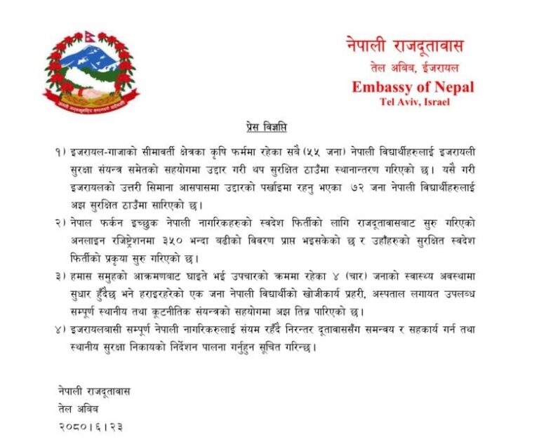 इजरायल–गाजाको सीमावर्ती क्षेत्रका कृषि फार्ममा रहेका सबै ५५ नेपाली विद्यार्थीलाई सुरक्षित ठाउँमा स्थानान्तरण गरिएको छ। इजरायलको उत्तरी सिमाना आसपासको क्षेत्रमा उद्धारको प्रतीक्षामा रहेका ७२ जनालाई पनि सुरक्षित ठाउँमा सारिएको तेलअबिबस्थित नेपाली राजदूतावासले जनाएको छ।