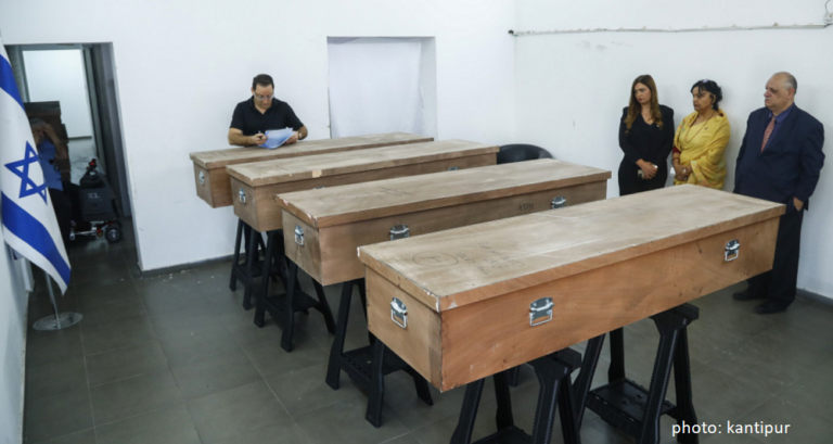 नेपाल पठाइएका चार शव नारायणप्रसाद न्यौपाने, लोकेन्द्रसिंह धामी, दिपेशराज बिष्ट र आशिष चौधरीको रहेको दूतावासले जानकारी गराएको छ। हमासको आक्रमणमा परी मारिएका अन्य ६ जना नेपालीको शव परीक्षणमा थप समय लाग्ने दूतावासले जनाएको छ।