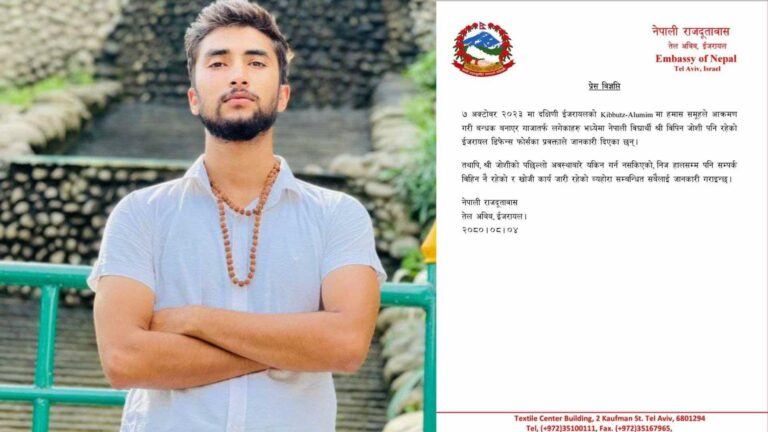 ‘हमास समूहले आक्रमण गरी बन्धक बनाएर गाजातर्फ लगेकाहरुमध्येमा नेपाली विद्यार्थी विपिन जोशी पनि रहेको ईजरायल डिफेन्स फोर्सका प्रवक्ताले जानकारी दिएको छ। तर, जोशीको पछिल्लो अवस्थावारे यकिन गर्न नसकिएको, निज हालसम्म पनि सम्पर्क विहिन नै रहेको र खोजी कार्य जारी रहेको व्यहोरा सम्बन्धित सबैलाई जानकारी गराइन्छ,’ परराष्ट्रले जनाएको छ।