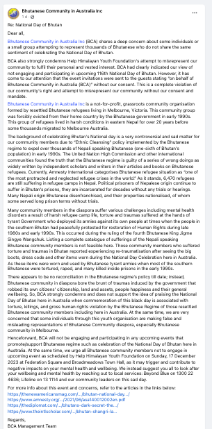 साथै, संस्थाले जारी गरेको प्रेस नोटमा भुटानको राष्ट्रिय दिवस मनाउँदा त्यसले अष्ट्रेलियामा पुनस्र्थापना गरिएका भुटानी शरणार्थीहरुको मनमा त्रास सिर्जना गर्ने, मानसक तनाव बढाउने र हिजो खेदिएको, नेपालमा २० औं वर्ष शरणार्थी शिविरमा विताएको स्मरणमा आउने सम्भावना रहने उल्लेख गरिएको छ ।