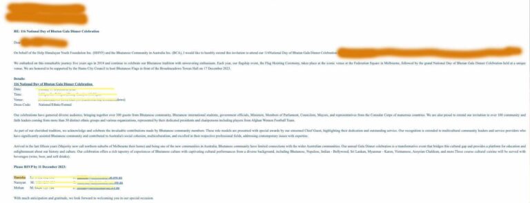भुटनीज कम्युनिटी ईन अष्ट्रेलिया बीसीए ले आफुहरु कार्यक्रममा सहभागी नभएको जनाएको छ भने आफ्नो संस्थाको नाम विना अनुमति कुनै परामर्शविना संलग्न गराइएकोमा आपत्ति समेत जनाएको छ । शुक्रबार एक प्रेस नोट जारी गर्दै अष्ट्रेलियामा गैरनाफामूलक संस्थाको रुपमा दर्ता भएको भुटनीज कम्युनिटी ईन अष्ट्रेलियाले झण्डोत्तोलन कार्यक्रमको आयोजक संस्थाले अतिथिहरुलाई पठाएको पत्रमा आफ्नो संस्थाको समेत नाम प्रयोग गरिएको दावी गरेको छ । यस्तो गर्नु अष्ट्रेलियन कानून विपरित हुन जाने र यसले समाजमा भ्रम सिर्जना गर्ने भएकोले यस्तो कार्य नगर्न पनि बीसीएले अनुरोध गरेको छ ।