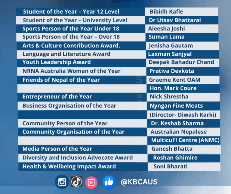कार्यक्रममा नेपाली समूदायका अगुवाहरु, एनआरएनका पदाधिकारीले एवार्ड हस्तान्तरण गरेका थिए । यस्तै एनआरएन अष्ट्रेलिया लाईफटाईम अचिभमेन्ट एवार्ड न्यूसाउथवेल्सका पूर्वमहावाणिज्यदूत दिपक खड्कालाई, एनआरएन जुरी एवार्ड मन केसी र सन्ध्या शाहलाई प्रदान गरिएको थियो ।