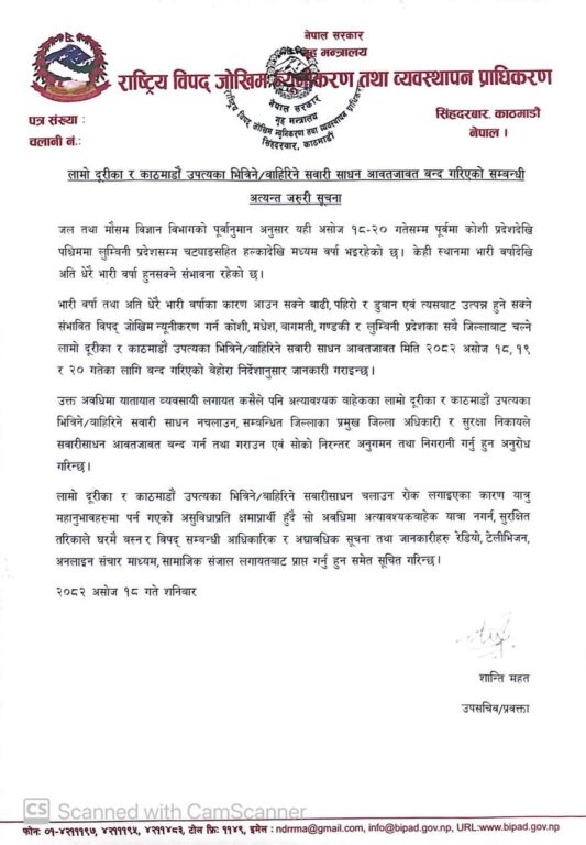 काठमाडौं। अविरल वर्षा र त्यसले निम्त्याउने बाढी तथा पहिरोको जोखिमलाई ध्यानमा राख्दै राष्ट्रिय विपद् जोखिम न्यूनीकरण तथा व्यवस्थापन प्राधिकरणले काठमाडौं उपत्यका भित्रिने र बाहिरिने सम्पूर्ण सवारी साधन तीन दिनका लागि बन्द गर्ने निर्णय गरेको छ।