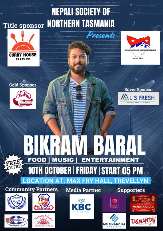 लन्सेस्टन, तस्मानिया । नेपाली सोसाइटी अफ नर्दन तस्मानियाले आउँदो शुक्रबार, अक्टोबर १०, २०२५ मा दसैं–तिहार विशेष कार्यक्रम आयोजना गर्ने भएको छ। म्याक्स फ्राइ हल, ट्रेभालिनमा बेलुकी ५ बजेदेखि सुरु हुने कार्यक्रममा प्रवेश निःशुल्क हुनेछ।