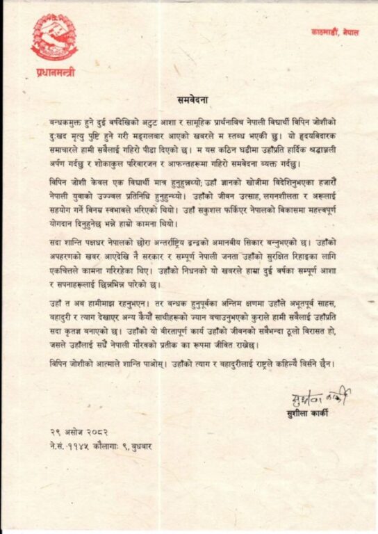 काठमाडौं । प्रधानमन्त्री सुशीला कार्कीले नेपाली विद्यार्थी विपिन जोशीको निधनप्रति गहिरो शोक व्यक्त गर्दै उहाँप्रति श्रद्धाञ्जली अर्पण गर्नुभएको छ।