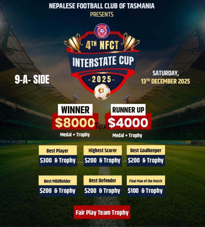 तास्मानिया। नेप्लिज फुटबल क्लब तास्मानिया (एनएफसीटी) ले आयोजना गर्ने “चौथो एनएफसीटी इन्टरस्टेट कप २०२५” आगामी डिसेम्बर १३, शनिबार का दिन न्यू टाउनस्थित कोर्नेलियन बे ओभलमा हुने भएको छ। अस्ट्रेलियाभरका नेपाली कम्तीमा १६ फुटबल टिमबीच प्रतिस्पर्धा हुने यो कप नौ–ए–साइड फुटबल स्वरूपमा खेलिनेछ।