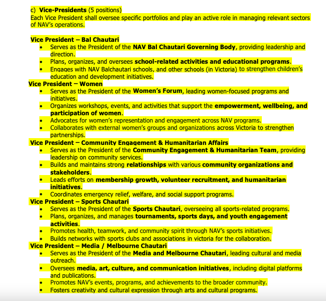 उनका अनुसार संशोधित नयाँ विधान अनुसार उपाध्यक्ष बाल चौतारी, उपाध्यक्ष महिला, उपाध्यक्ष समूदाय संलग्नता र मानवीय मामिला, उपाध्यक्ष स्पोर्टस चौतारी, उपाध्यक्ष मिडिया र मेलबर्न चौतारी रहनेछन् । यस बाहेकपनि कार्यकारी उपाध्यक्षका रुपमा एकजना समेत रहने व्यवस्था गरिएको छ । संशोधित विधान अनुसार आगामी वर्ष हुने निर्वाचनमा उपाध्यक्षहरुको चयन गरिनेछ । यससँगै कार्यसमितिको प्रमुख पदमा ९ जना र कार्यसमिति सदस्यहरुमा ८ जनाको कूल कार्यसमिति बन्नेछ ।