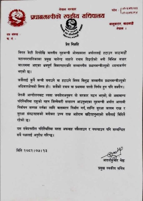 काठमाडौं महानगरपालिकाका प्रमुख बालेन्द्र शाहले गृहमन्त्री अर्याललाई हटाउन प्रधानमन्त्रीलाई दबाब दिएको समाचार सार्वजनिक भएपछि प्रधानमन्त्रीको सचिवालयले कसैको दबाब वा प्रभावमा निर्णय नहुने जनाएको हो ।