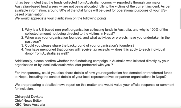 अष्ट्रेलियामा सञ्चालनमा रहेका दुईवटा ठूला फन्ड रेजिङ अभियानले एनजीओ पार्टनरका रुपमा मनोनित गरेको दायित्व युएससँग हामीले सम्पर्क गरेका छौं । उक्त संस्था सन् २०१५ अप्रिल २५ मा खोलिएको रहेछ । संस्थाले आफुहरु गैरनाफामूलक गैरसकारी संस्था भएको र दाताहरुले सहयोग गर्ने रकममा कर समेत नलाग्ने उल्लेख गरेको छ । नेपालमा विभिन्न सहयोगका कामहरु समेत गर्दै आएको संस्थाले आफ्नो सामाजिक सञ्जालमा भिडियो र पोष्टहरुमार्फत जानकारी गराएको हामीले पायौं । केविसीखबरसँगको सम्पर्कमा आएका राजेश सुरानाले हालसम्म १२ लाख डलर बराबरको सहयोग गरिसकेको दावी गरे । उनले नेपालमा विभिन्न संघसंस्थाहरुसँगको सहकार्यमा राहतका कामहरु गरिरहेको बताएका छन् । उनले अष्ट्रेलियामा संकलन गरिएको रकम हालसम्म संस्थाको खातामा आइनसकेको पुष्टि गरे । उनले सहयोग रकम प्राप्त हुनेबित्तिकै नेपालमा जेन्जी आन्दोलनका क्रममा ज्यान गुमाएका शहीद परिवार र घाइतेहरुको उपचारका लागि वितरण गरिहाल्ने आफुहरुको योजना रहेको पनि जानकारी दिएका छन् । हामीले उनलाई सोधेका थियौं