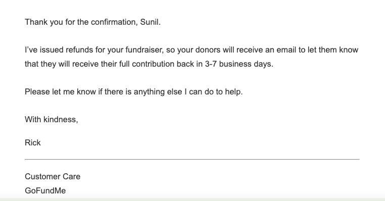 केविसीखबरसँगको सम्पर्कमा आएका सुनील गिरी जो न्यूसाउथवेल्समा बसोबास गर्दछन् उनले आफुले १० हजार डलरको लक्ष्य राखेर सहयोग संकलन गरेपनि उठेको ४ सय १३ डलर पुनः दाताहरुकै खातामा फिर्ता गर्नका लागि पत्राचार गरेको प्रमाण पेश गरेका छन् । उनले केही दिनभित्र नै दाताहरुलाई पैसा फिर्ताको नोटिस दिने गोफन्डले जनाएको समेत बताए । गिरीले लक्षित रकम नउठेको र वितरणमा पनि समस्या हुने देखेपछि रकम दातालाई नै फिर्ता गर्नका लागि पत्राचार गरेको जनाएका छन् ।