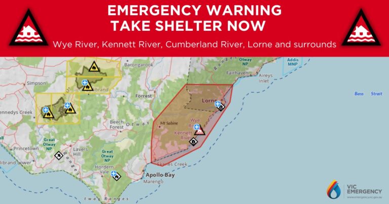 बिहीबार दिउँसो तीव्र वर्षासहितको आँधीले Wye River, Kennett River, Cumberland River, Lorne र आसपासका बस्तीहरू प्रभावित भएपछि स्थानीय बासिन्दा र पर्यटकलाई सुरक्षित स्थानमा बस्न आग्रह गरिएको थियो। सामाजिक सञ्जालमा सार्वजनिक भिडियोहरूमा ध्थभ च्ष्खभच क्षेत्रमा तीनवटा कार समुद्रतर्फ बगिरहेको देखिन्छ भने अन्य केही कार पुलमा अड्किएका वा बाढीमा डुबेका छन् ।