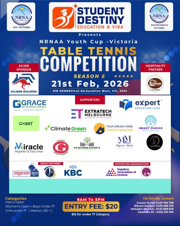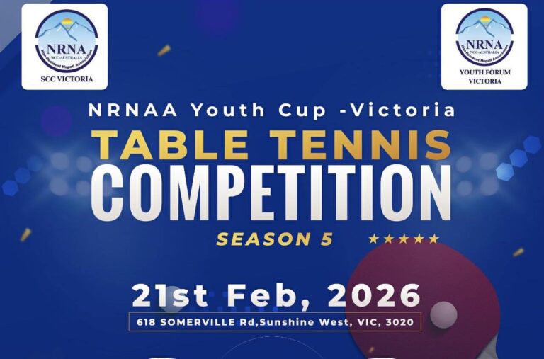 गैरआवासीय नेपाली संघ अष्ट्रेलिया भिक्टोरिया राज्य समितिको आयोजनामा पाचौं संस्करणको युथ कप टेबल टेनिस प्रतियोगिता आयोजना हुने भएको छ ।