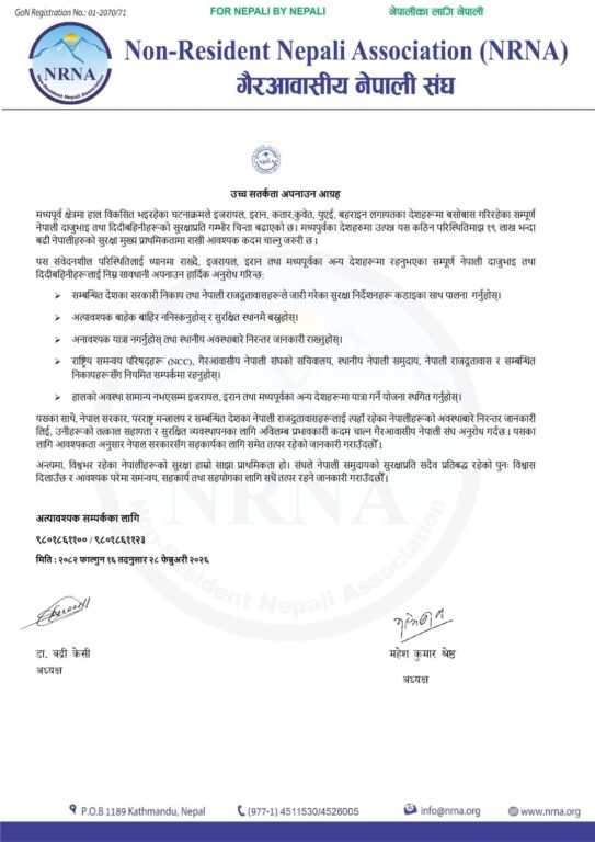 यसैबीच, एनआरएनले पनि मध्यपूर्वमा रहेका आफ्ना राष्ट्रिय समन्वय परिषद् मार्फत प्रभावित देशहरुमा रहेका नेपालीको सुरक्षामा चासो व्यक्त गर्दै उद्धार गर्नुपरेको अवस्थामा सहकार्य गरेर अघि बढ्ने जानकारी गराएको छ ।