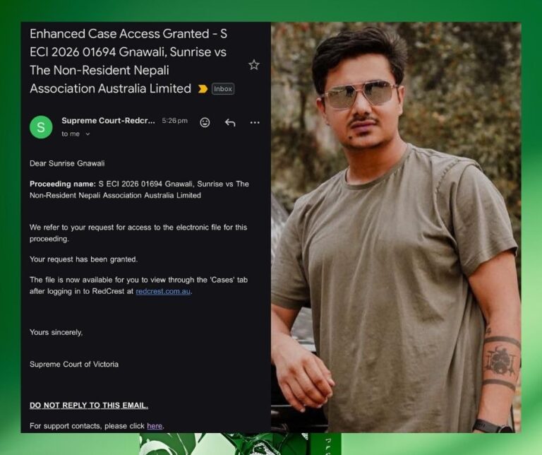 भिक्टारियाको सर्वोच्च अदालतमा भिक्टोरिया युवा संयोजक पदका उम्मेद्वार सनराईज ज्ञवालीले मुद्दा हालेका हुन् । मुद्दा दर्ताका लागि यसअघि नै निवेदन दिएको भएपनि त्यसमा प्राविधिक विषयवस्तुहरु नमिलेको कारण अहिले मात्र दर्ता भएको हो । ज्ञवालीले मुद्दा आफैं लड्ने बताएका छन् ।