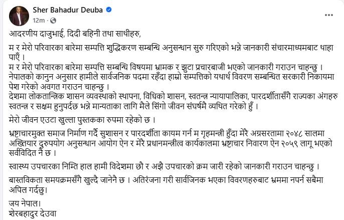 देउवाले बुधबार साँझ फेसबुकमा नेपालको कानुनअनुसार सार्वजनिक पदमा रहँदा आफ्नो सम्पत्तिको यथार्थ विवरण सम्बन्धित सरकारी निकायमा पेस गरेको उल्लेख गरेका छन् । “म र मेरो परिवारका बारेमा सम्पत्ति सम्बन्धि विषयमा भ्रामक र झुटा प्रचारबाजी भएको जानकारी गराउन चाहन्छु,” उनले लेखेका छन् ।