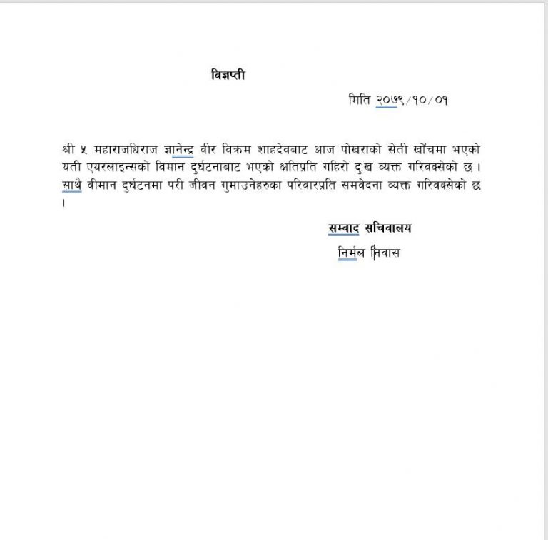 पुर्व राजाका शाहका सम्वाद सचिवालयका फणिराज पाठकले जारी गरेको बिज्ञप्ति अनुसार शाहले विमान दुर्घटनामा परी जीवन गुमाउनेहरूका परिवारप्रति समवेदनासमेत व्यक्त गरिेएको छ ।