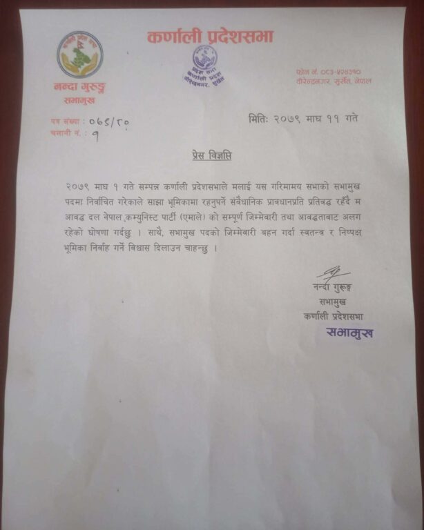 कर्णाली प्रदेशसभाकी सभामुख नन्दा गुरुङले नेकपा एमालेसँगको सबै आवद्धता त्यागेको घोषणा गरेकी छन्। बुधबार विज्ञप्ति जारी गरेर उनले साझा भूमिकामा रहनुपर्ने सभामुखमा निर्वाचित भएकाले एमालेको सम्पूर्ण जिम्मेवारी र आवद्धताबाट अलग भएको घोषणा गरेकी हुन्।