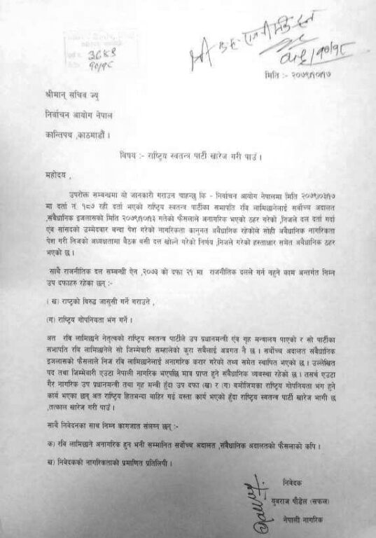 पौडेलले निर्वाचन आयोगलाई सो पार्टीका सभापति रवि लामिछानेलाई सर्वोच्च अदालतको संवैधानिक इजलासले उमेदवार बन्दा पेस गरेको नागरिकता अवैधानिक ठहर गरेकोले सोही नागरिकता पेस गरी लामिछानेले गरेका निर्णयहरु अवैध हुने भएकाले तत्काल पार्टी खारेजको माग गर्दै बुधबार निवेदन दिएका छन् ।