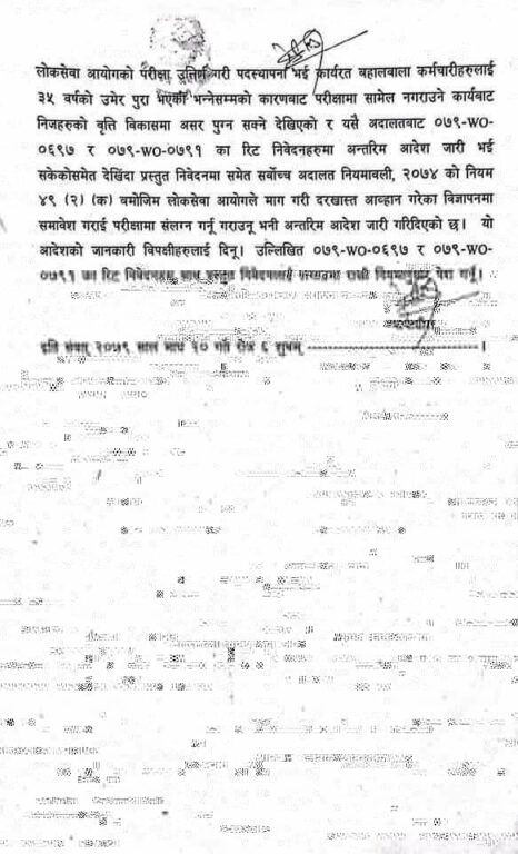 नेपाल निजामती कर्मचारी संगठनको तर्फबाट उपमहासचिव युवाचन्द्र घिमिरेले दायर गरेको रिटमाथि शुक्रबार सुनुवाइ गर्दै सर्वोच्चका न्यायाधीश कुमार चुँडालको एकल इजलासले लोकसेवाले दरखास्त आह्वान गरेका विज्ञापनमा बहालवाला कर्मचारीलाई सहभागी गराउन अन्तरिम आदेश दिएको हो ।