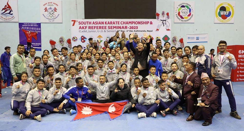 काठमाडौं । नेपालले सातौं दक्षिण एसियाली कराते च्याम्पियनसिपमा आइतबार सर्वाधिक २९ स्वर्ण पदक जित्दै च्याम्पियन बनेको छ। नेपालले थप २६ रजत र ६ कांस्यपदक पनि जित्यो। त्रिपुरेश्वरस्थित राष्ट्रिय खेलकुद परिषद् (राखेप)को कभर्डहलमा भएको प्रतियोगितामा भारत २५ स्वर्ण, २२ रजत र १७ कांस्यसाथ दोश्रो भयो। नेपाल कराते महासंघद्वारा आयोजित प्रतियोगितामा तेश्रो स्थानको बंगलादेशले ६ स्वर्ण, ७…