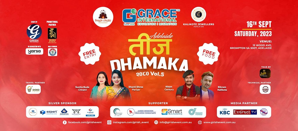 एडिलेड अष्ट्रेलिया । एडिलेडमा हिन्दु महिला दिदीबहिनीहरुको महान पर्व हरितालिका तिजको अवसरमा 'तीज धमका–५' हुने भएको छ। ग्रिस इभेन्ट एण्ड इन्टरटनमेन्टको आयोजनामा सेप्टेम्बर १६ शनिबार वुड एवेन्यू, ब्रॉम्पटन एडिलेडमा तिज धमाका–५ हुन लागेको हो। ग्रेस इटरनेशनल एजुकेशन एण्ड माइग्रेशन एडिलेड, फ्रेश चुलो रेष्टुरेन्ट र कालीकोटे ज्वेलरी एडिलेड टाइटल स्पोन्सर रहेको उक्त कार्यक्रममा नेपालका चर्चित कलाकार…