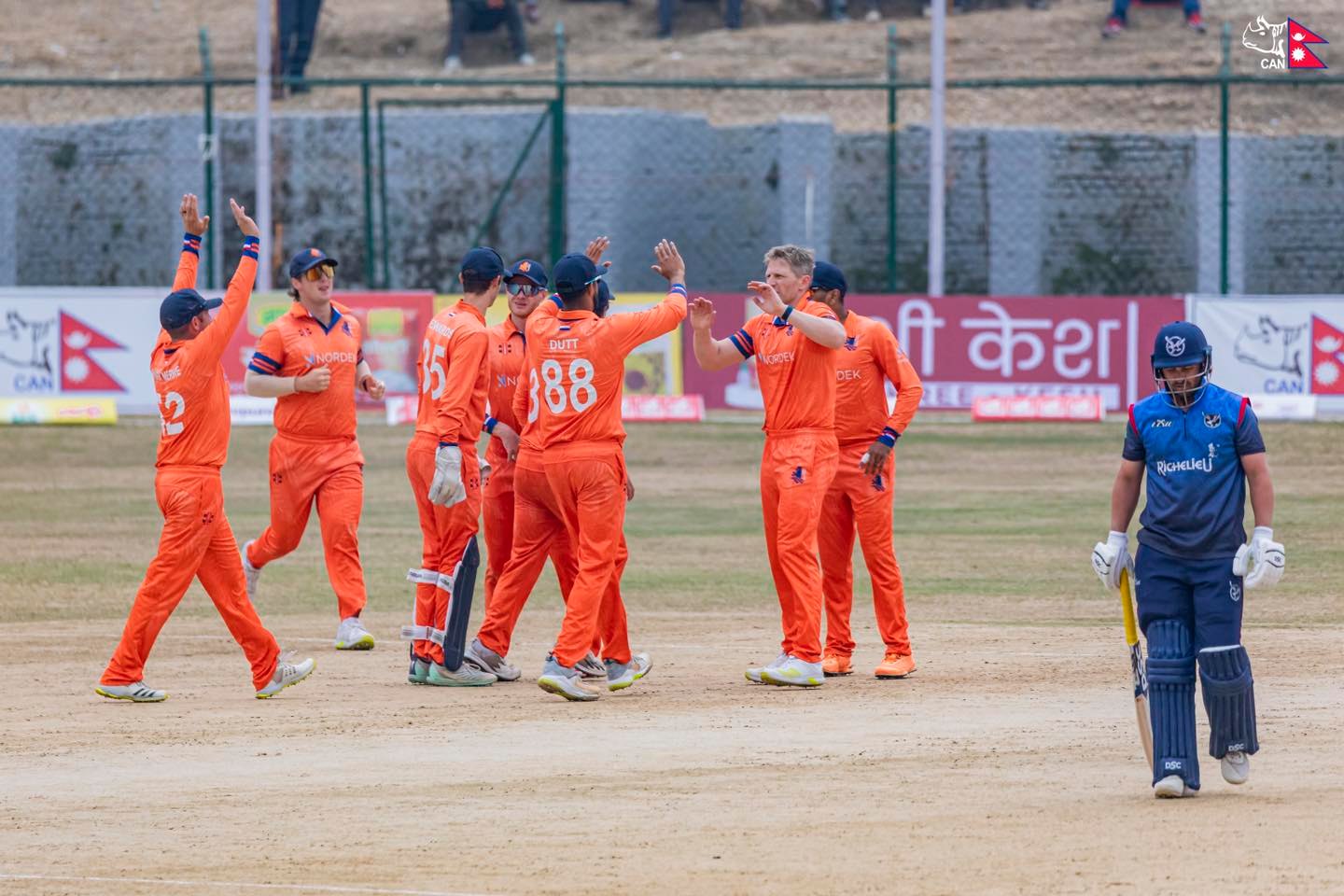 काठमाडौँ । त्रिकोणात्मक टी–२० सिरिजअन्तर्गत नामिबिया र नेदरल्यान्ड्सबीचको लिग चरणको अन्तिम खेल वर्षाका कारण रद्द भएको छ । खेल रद्द भएसँगै दुवै टोलीले एकरएक अङ्क बाँडेका छन्। योसँगै उक्त प्रतियोगिताको फाइनलमा नेपाल र नेदरल्यान्ड्स भिड्ने भएका छन्। नेदरल्यान्ड्स ५ अङ्कसहित शीर्षस्थानमा रहँदै फाइनलमा पुगेको हो। त्यस्तै दोस्रो स्थानमा रहेको नेपाल चार अङ्क जोड्दै फाइनलमा पुगेको…