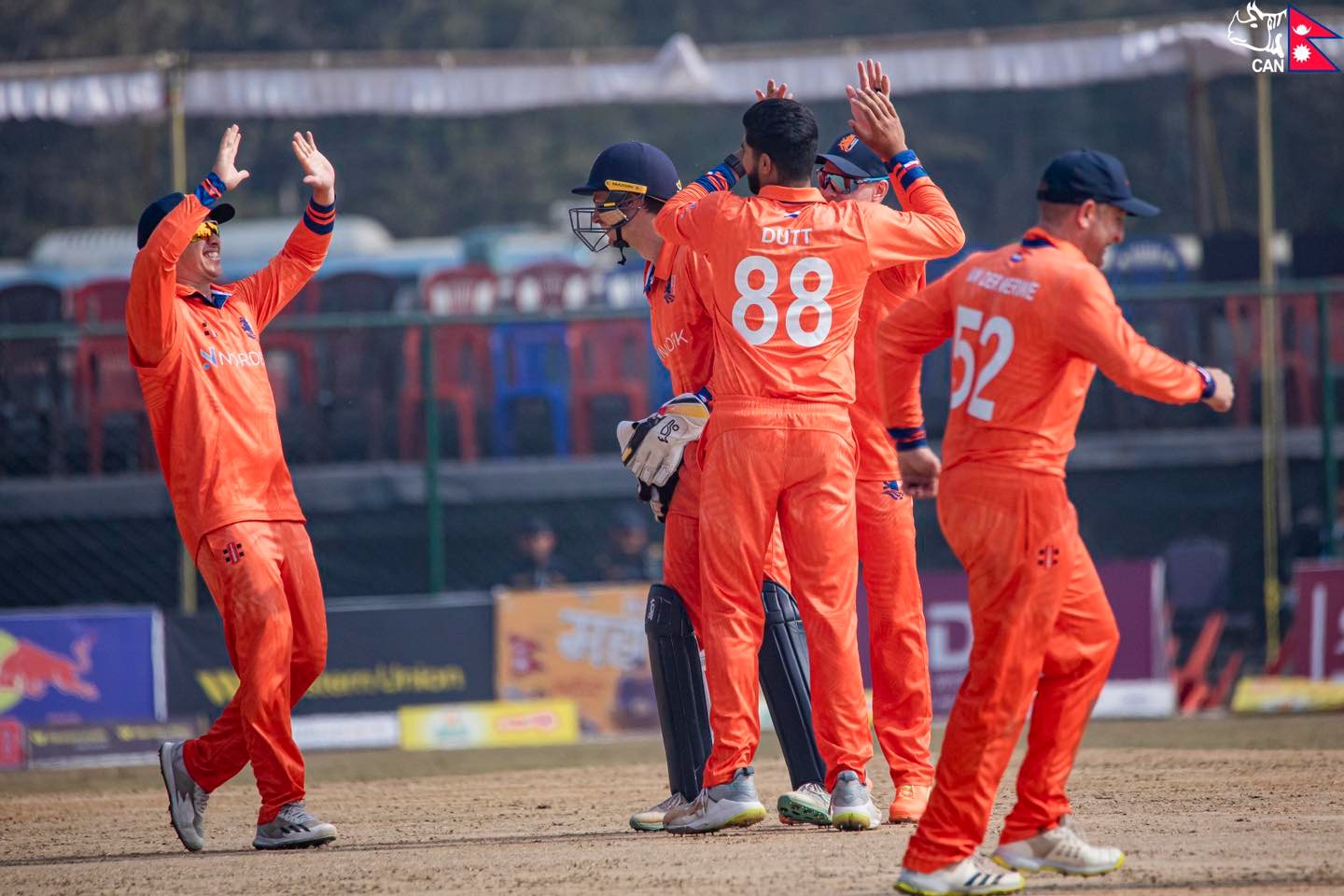 काठमाडौँ । आईसीसी पुरुष क्रिकेट विश्वकप लिग–२ अन्तर्गत नेपालमा जारी त्रिकोणात्मक एकदिवसीय अन्तर्राष्ट्रिय सिरिजमा नेदरल्यान्ड्सले नामिबियालाई पराजित गरेको छ। कीर्तिपुरस्थित त्रिवि क्रिकेट मैदानमा आज (सोमबार) भएको खेलमा नेदरल्यान्ड्सले नामिबियामाथि ७ विकेटको शानदार जित निकालेको हो। जितका लागि १२४ रनको लक्ष्य नेदरल्यान्ड्सले २७ ओभर २ बलमा ३ विकेटको क्षतिमा पूरा गर्याे। नेदरल्यान्ड्सलाई जित दिलाउन माइकल लेभिटले…