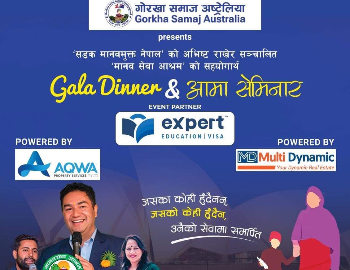 मेलबर्न, अष्ट्रेलिया । बेसहाराका लागि सहारा बनेको मानव सेवा आश्रमको सहयोगार्थ अष्ट्रेलियामा 'गाला डिनर र आमा सेमिनार' हुने भएको छ। गोरखा समाज अष्ट्रेलियाले मानवीयताको लागि अष्ट्रेलियाका बिभिन्न सहरमा गाला डिनर र आमा सेमिनार गर्न लागेको हो। समाजले फेब्रुअरी १७ तारिख शुक्रबार इन्द्रेनी फंसन सेन्टरमा 'गाला डिनर'को आयोजना गरेको छ। साँझ ५ बजेबाट सुरु हुने उक्त गाला…