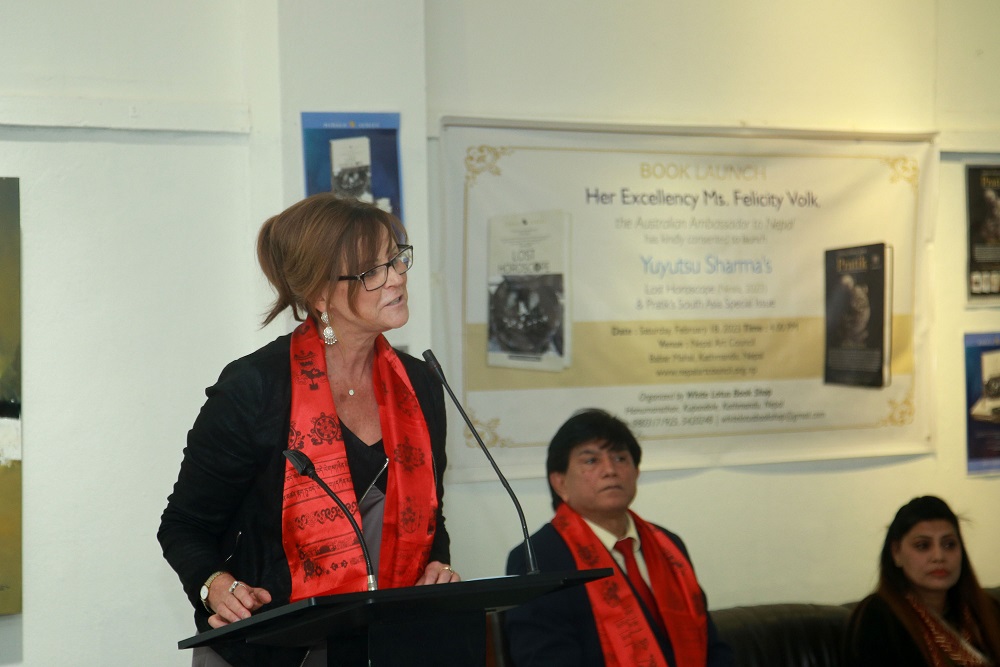 काठमाडौँ । नेपालका लागि अस्ट्रेलियाका राजदूत फेलिसिटी भोकले कवि युयुत्सु शर्माद्वारा अङ्ग्रेजी भाषामा लिखित काव्यसङ्ग्रह ‘लस्ट होरोस्कोप’ (हराएको चिना) शनिबार यहाँ विमोचन गरेकी छन् । निराला पब्लिकेसन्स, नयाँ दिल्ली भारतद्वारा प्रकाशित कृतिमा कोभिड कोभिड महामारीबाट भएको क्षति, उपचार र निको भएको तथा अमेरिका, युरोप र ल्याटिन अमेरिका भ्रमणका विषय समाविष्ट छन् । कार्यक्रममा ‘प्रतीक’ अङ्ग्रेजी…