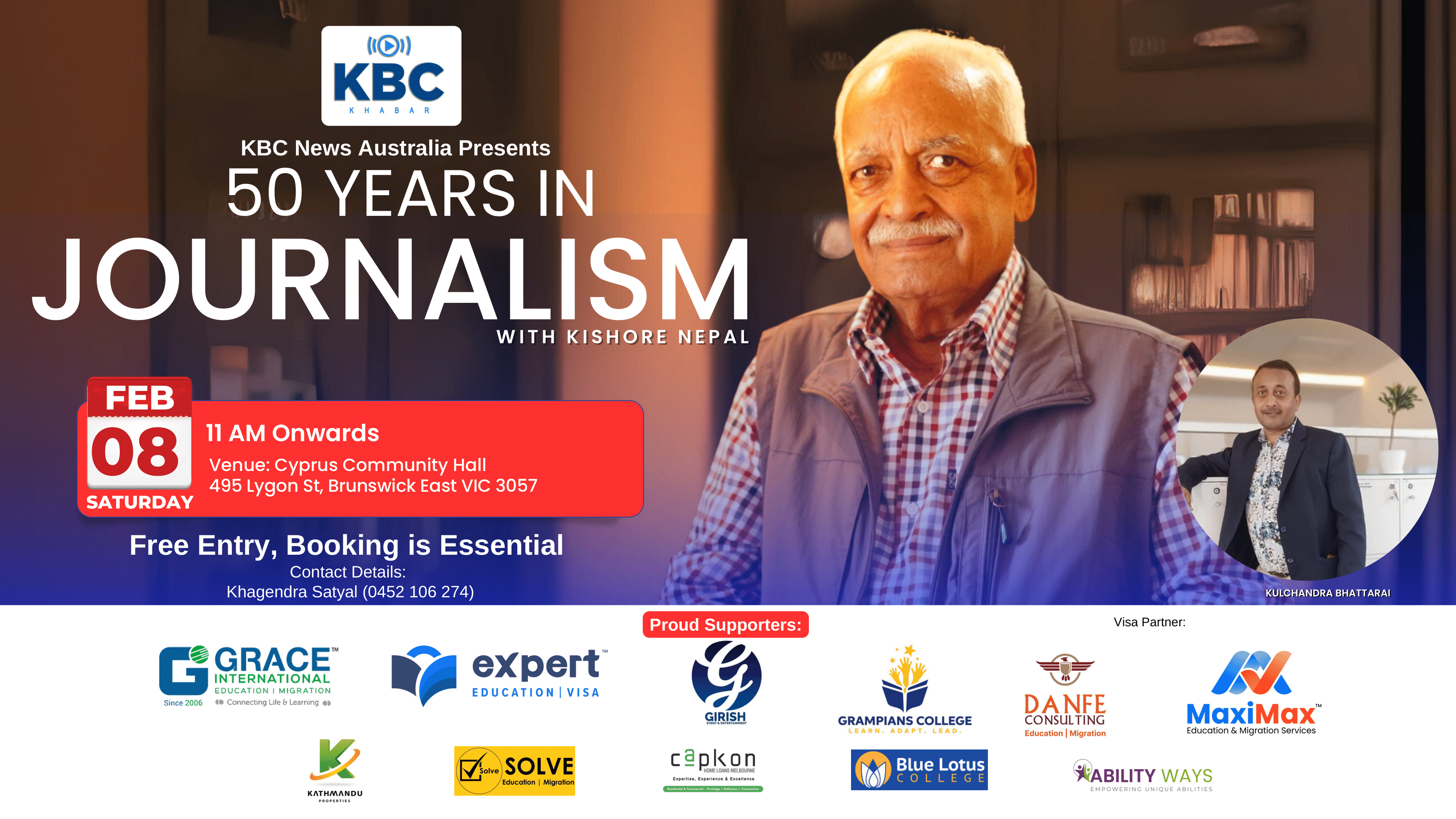 मेलबर्न, अष्ट्रेलिया ।केविसीखबरको निमन्त्रणमा नेपालका वरिष्ठ पत्रकार किशोर नेपाल अष्ट्रेलिया आइपुगेका छन् । नेपाली पत्रकारिताका हस्ती नेपालको सम्मानमा शनिबार मेलबर्नको साईप्रस कम्युनिटी सेन्टरमा एक कार्यक्रम आयोजना गरिएको छ । कार्यक्रममा नेपालले आफ्नो पत्रकारिता यात्रा, नेपालको राजनीतिक परिवर्तन र उतार चढावबारे एक प्रस्तुति दिनेछन् । नेपालका साथ कान्तिपुर टेलिभिजनका वरिष्ठ सम्पादक कुलचन्द्र भट्टराई पनि अष्ट्रेलिया आइपुगेका…