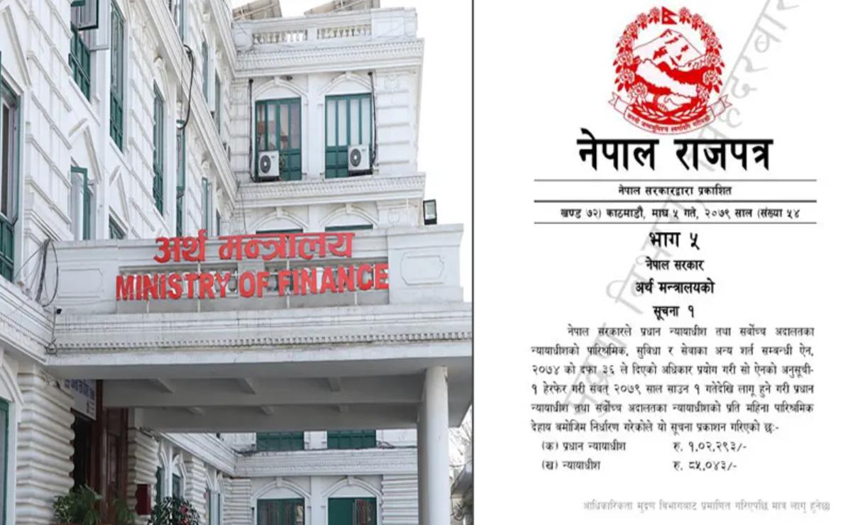 काठमाडौँ । सरकारले सर्वोच्च अदालतका प्रधान न्यायाधीशसहित विभिन्न पदाधिकारीको नयाँ तलबमान गत साउन १ गतेदेखि लागू हुने गरी कायम गरेको छ । राजपत्रमा सूचना प्रकाशित गर्दै अर्थ मन्त्रालयले सर्वोच्च अदालतका प्रधान न्यायधीश तथा सर्वोच्च अदालतका न्यायधीशको सेवा सुविधा तथा अन्य शर्तहरु र तलमबमान कायम गरिएको जानकारी गराएको हो । अर्थ मन्त्रालयले प्रधानन्यायाधीश, न्यायाधीश, उच्च अदालतका…