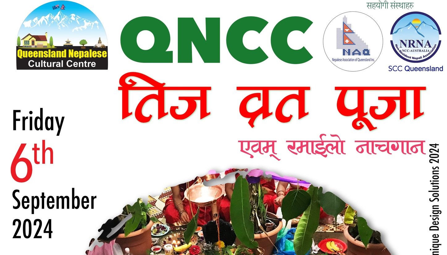 ब्रिजवेन, अष्ट्रेलिया । क्विीन्सल्याण्डमा नेपाली हिन्दु महिलाहरूको महान् चाड हरितालिका तीजको अवसरमा सामूहिक पूजा तथा नाचगानको कार्यक्रम आयोजना गरिएको छ। क्वीएनसीसी, एनआरएन क्वीन्सल्याण्ड र एनएक्वीले संयुक्त रूपमा उक्त कार्यक्रमको आयोजना गरेका हुन्। सेप्टेम्बर ६ तारिख शुक्रबार दिउँसो २ बजेबाट सुरु हुने उक्त कार्यक्रममा नेपाली पण्डितद्वारा सामूहिक पूजा, टिका तथा प्रसाद वितरण र नाचगान गरिने क्वीएनसीसीका…