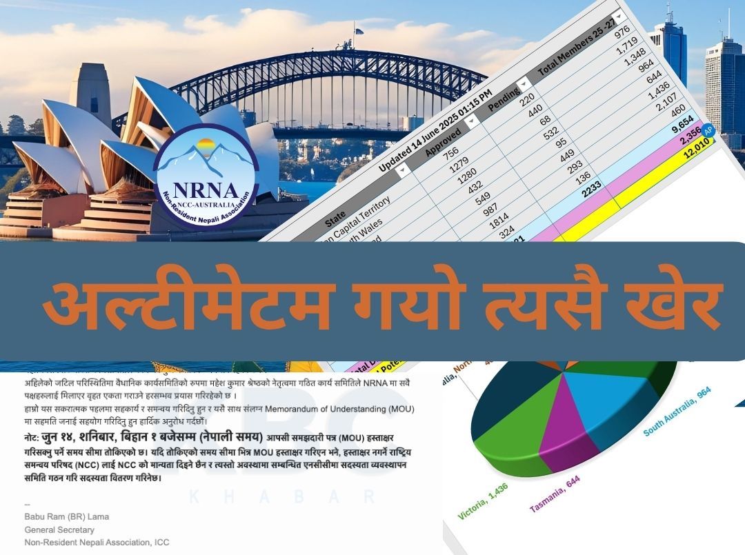 मेलबर्न, अष्ट्रेलिया । गैरआवासीय नेपाली संघ अष्ट्रेलियाको आसन्न निर्वाचनलाई नै प्रभावित पार्नसक्नेगरी अर्को संस्था दर्ता भएपछि बढेको विवाद महेश श्रेष्ठ नेतृत्वको आईसीसीका महासचिव भनिएका वीआर लामाले पठाएको सम्झौतापत्र र त्यसमा दिइएको ४८ घण्टे अल्टिमेटमपछि झन् नयाँ मोडमा पुगेको छ । दुबै पक्षले सहमतिको कुरा गरेपनि आफ्नो अडान भने छाडेका छैनन् । दिइएको ४८ घण्टाभित्र एनआरएन…