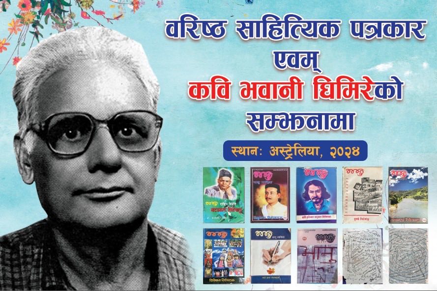 क्यानबेरा, अष्ट्रेलिया । वरिष्ठ साहित्यिक पत्रकार एवं कवि भवानी घिमिरेको सम्झनामा अष्ट्रेलियाको राजधानी क्यानबेरामा कार्यक्रम हुने भएको छ । शनिबार क्यानबेरास्थित नेपाली राजदूतको निवासमा हुन लागेको कार्यक्रम भानु परिवारले गर्न लागेको हो । कवि घिमिरे साहित्यिक पत्रकार संघका संस्थापक अध्यक्ष हुन् । नेपालसँगै अष्ट्रेलियामा पनि उनको सम्झनामा कार्यक्रम गर्न लागिएको हो । कवि घिमिरेकी छोरी…