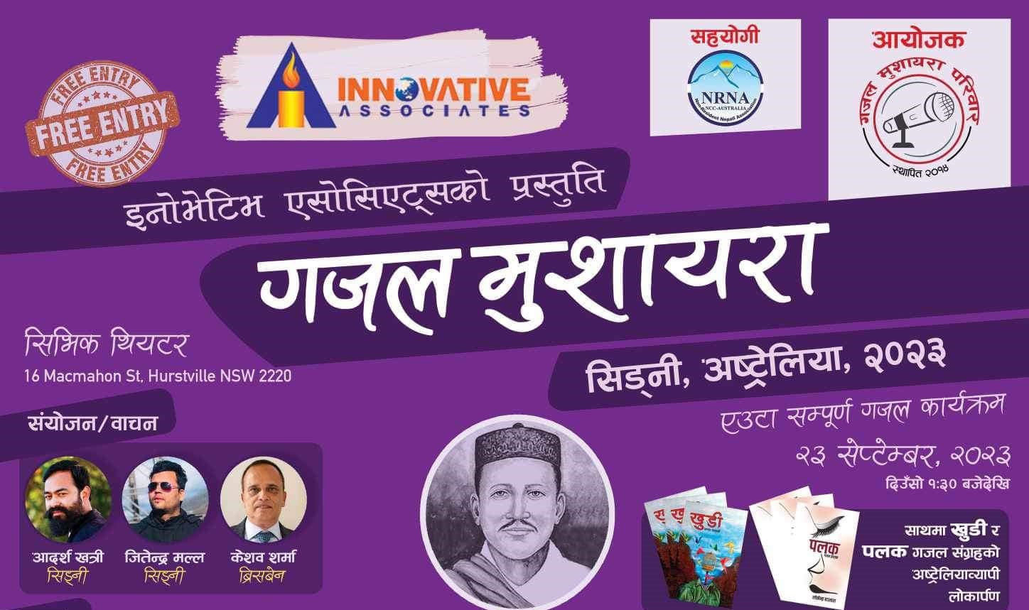 मेलबर्न अष्ट्रेलिया । सिड्नीमा ‘गजल मुशायरा’ कार्यक्रमको नयॉं संस्करण हुने भएको छ। १५८ औं मोती जयन्तीको अवसर पारेर सेप्टेम्बर २३ तारिख (भोलि) शनिबार हर्स्टभिल १६ म्याकमोहन स्ट्रिट स्थित सिभिक थियटरमा उक्त कार्यक्रम हुन लागेको हो। एनआरएनए अष्ट्रेलियाले सघाएको उक्त कार्यक्रम अपरान्ह १ः३० बजेदेखि कार्यक्रम सुरु हुने आयोजक गजल मुशायरा परिवारले जनाएको छ। इनोभेटिभ एसोसियसनले प्रायोजन…