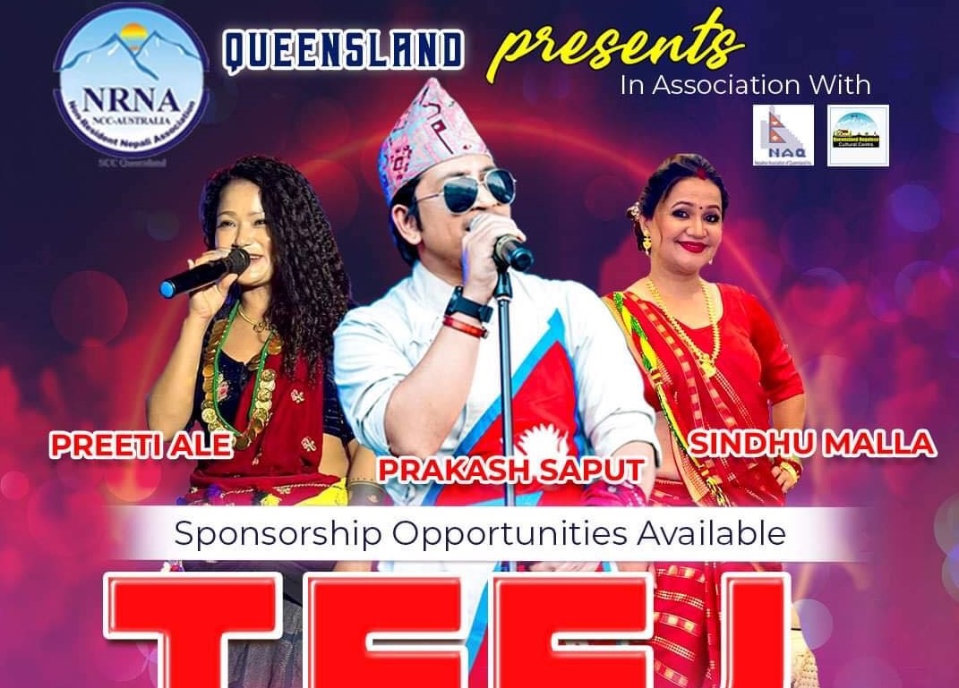 ब्रिस्वेन अष्ट्रेलिया । महिलाहरुको महान् चाड हरितालिका तीजको अवसरमा गैर आवासीय नेपाली संघ (एनआरएनए) क्वीन्सल्याण्डले तीज विशेष कार्यक्रमको आयोजना गर्ने भएको छ। सप्टेम्बर १५ तारिखका दिन स्ट्र्याथपाइन कम्युनिटी सेन्टर ब्रिस्वेनमा उक्त कार्यक्रमको हुन लागेको हो। नेपालका चर्चित कलाकार प्रकाश सपुत, प्रिति आले र सिन्धु मल्लको प्रस्तुति रहने आयोजना गरिने एनआरएनए क्वीन्सल्याण्डका नवनिर्वाचित संयोजक शम्भु गाईसीले…