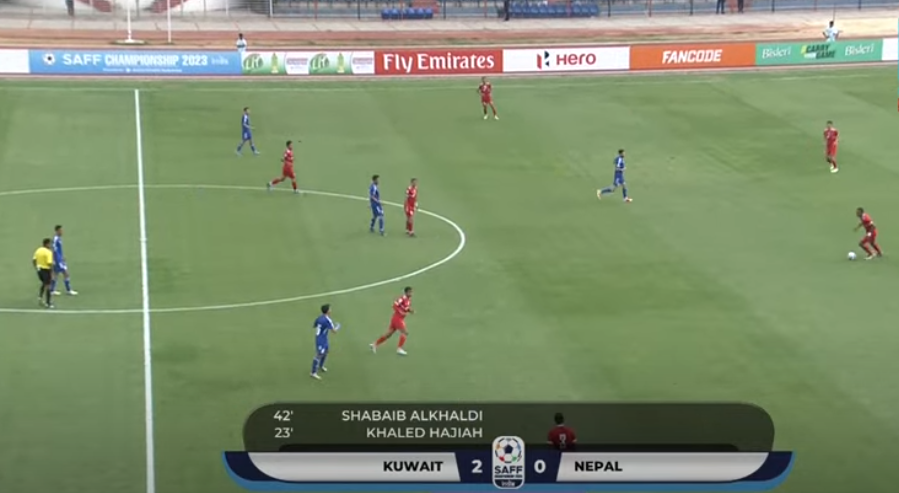 काठमाडौँ । साफ च्याम्पियनसिप पुरुष फुटबल प्रतियोगिताको उद्घाटन खेलमा नेपाल कुवेतसँग पहिलो हाफमा २ गोलले पछि परेको छ। भारतको बैंगलोरस्थित श्री कांतिराव स्टेडियममा भएको खेलमा कुवेतले नेपालविरुद्ध २ गोल गरेको छ। खेलको पहिलो हाफ सकिदा कुवेतले खेलमा २–० गोलको अग्रता लिएको छ। खेलको २३औं मिनेटमा कुवेतले अग्रता लियो। कुवेतका लागि कप्तान खालिद हाजियाले गोल गरे।…