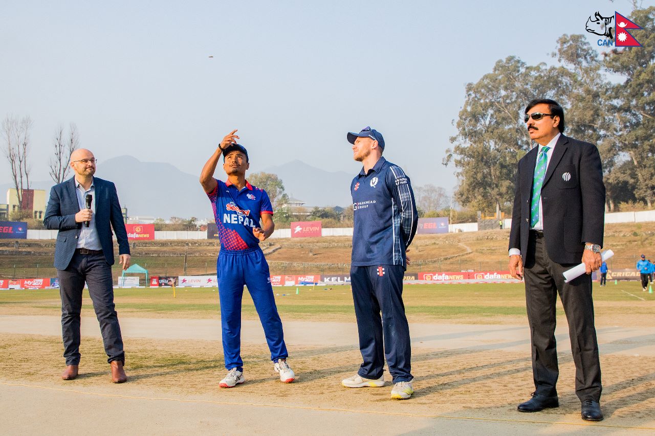 काठमाडौँ । आईसीसी विश्वकप क्रिकेट लिग–२ को अन्तिम खेलमा नेपालले टस जितेर पहिले फिल्डिङ गर्ने निर्णय गरेको छ । कीर्तिपुरस्थित त्रिभुवन अन्तर्राष्टिय त्रिकेट मैदानमा जारी खेलमा नेपालले टस जितेर पहिले फिल्डिङ रोजेको हो । यससँगै स्कटल्याण्डले अब पहिले ब्याटिङ गर्ने भएको छ । नेपालले तीन खेलमा जीत निकालेको छ । दुई खेलमा नामिबियालाई हराएको थियो…
