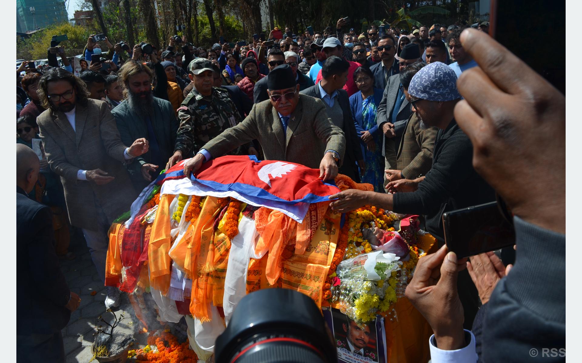 काठमाडौँ । प्रधानमन्त्री पुष्पकमल दाहाल ‘प्रचण्ड’ले वरिष्ठ गायक तथा सङ्गीतकार भक्तराज आचार्यले दिएको योगदानले गीत–सङ्गीतको क्षेत्रमा लामो समयसम्म उत्प्रेरणा र दिशानिर्देशन गरिरहने बताएका छन्। आज नेपाल सङ्गीत तथा नाट्य प्रज्ञा–प्रतिष्ठान पुगी आचार्यको पार्थिव शरीर श्रद्धाञ्जलि अर्पण गर्दे प्रधानमन्त्री दाहालले उनको योगदान मुलुकका लागि महत्वपूर्ण रहेको स्मरण गरे। उनले स्व आचार्यको पार्थिव शरीरमा राष्ट्रिय झण्डा ओढाएर…