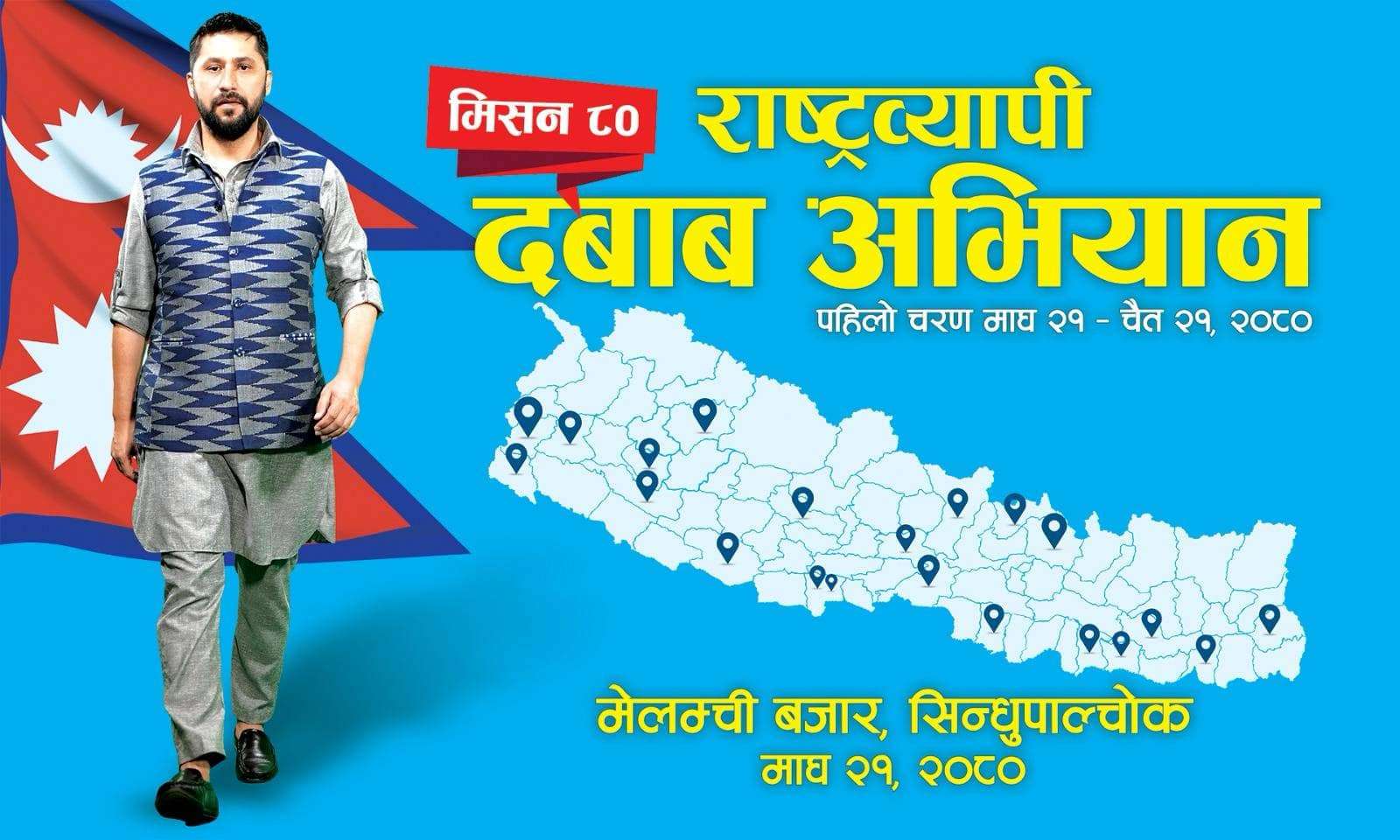 काठमाडौं । राष्ट्रिय गौरवका आयोजनाहरूमा सरकारले अपेक्षाअनुरुप काम गर्न नसकेको भन्दै राष्ट्रिय स्वतन्त्र पार्टी (रास्वपा)ले आजदेखि राष्ट्रव्यापी दबाब अभियान गर्दैछ। आइतबारदेखि दुई महिनासम्म सञ्चालन हुने दबाब अभियानको सभापति रवि लामिछानेले सिन्धुपाल्चोकको मेलम्ची बजारबाट उद्घाटन गर्दैछन्। रुग्ण र अलपत्र पारिएका विकास आयोजनाको काम अगाडि बढाउन सरकारको ध्यानाकर्षण गराउने उद्देश्यका साथ रास्वपाले राष्ट्रव्यापी दबाब अभियान सञ्चालन गर्न…